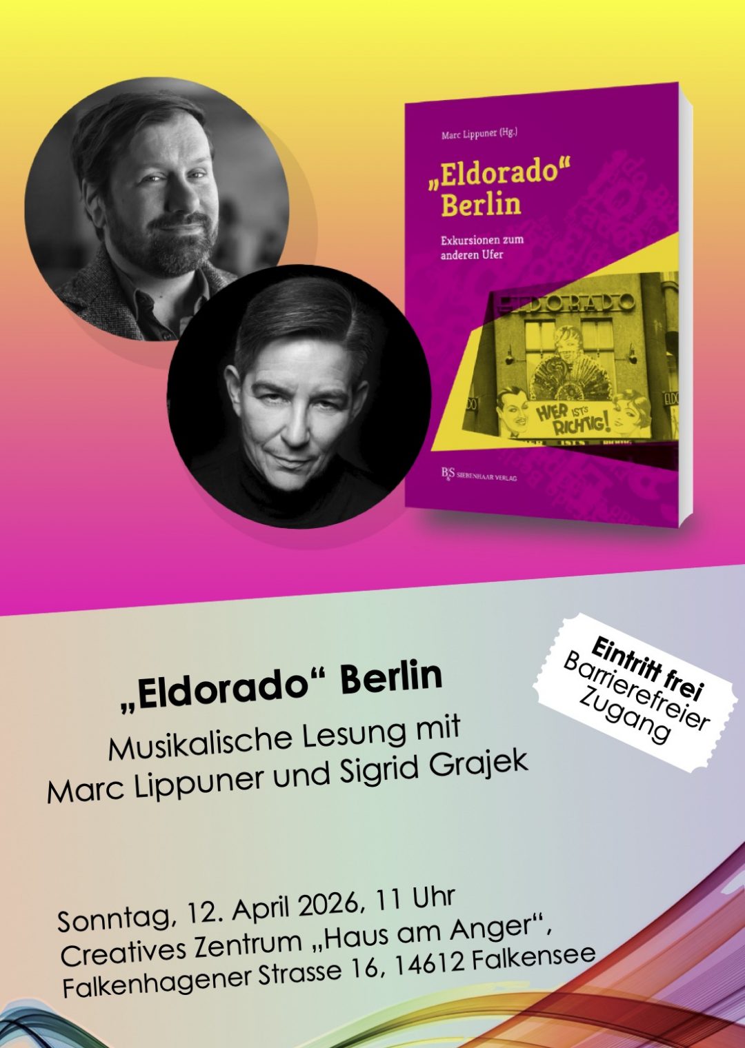 Am Sonntag, dem 12. April findet um 11 Uhr im Haus am Anger eine musikalische Lesung zu „Eldorado Berlin“ statt. Wir freuen uns sehr auf den Autor Marc Lippuner und die wunderbare Künstlerin Sigrid Grajek.